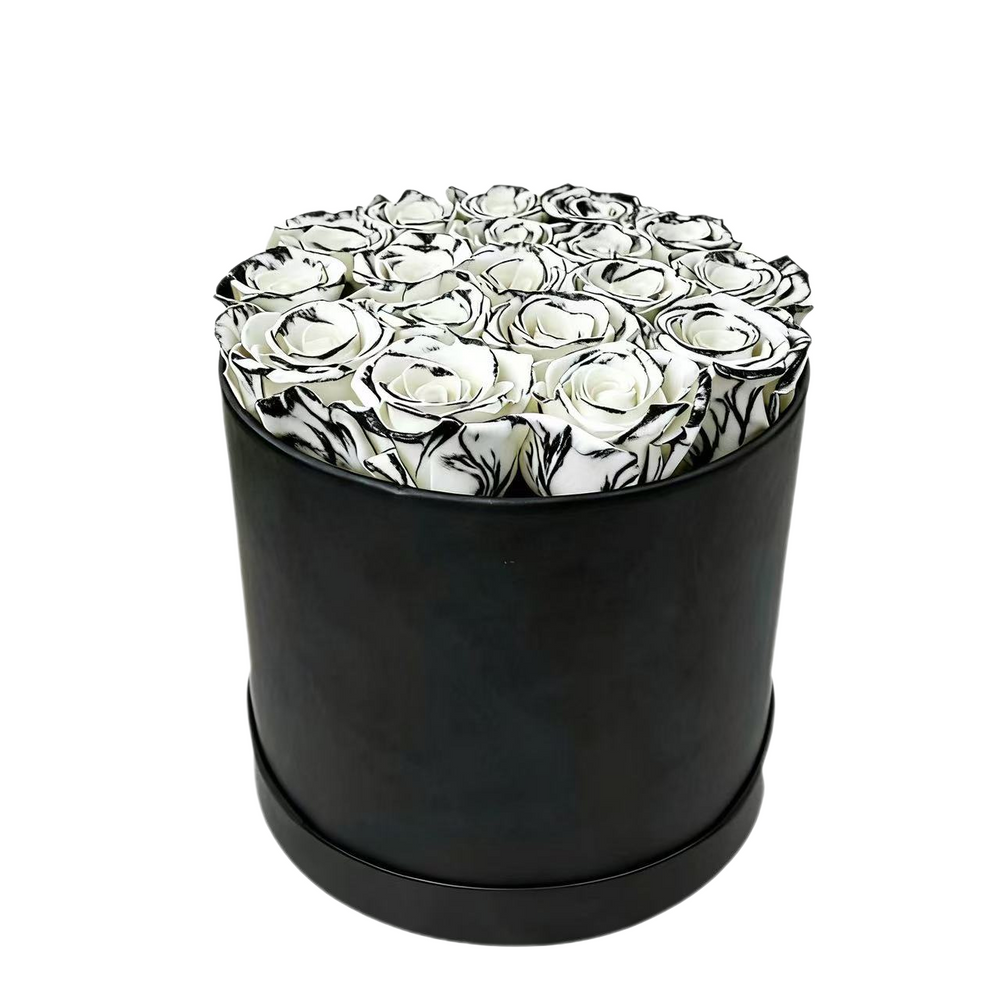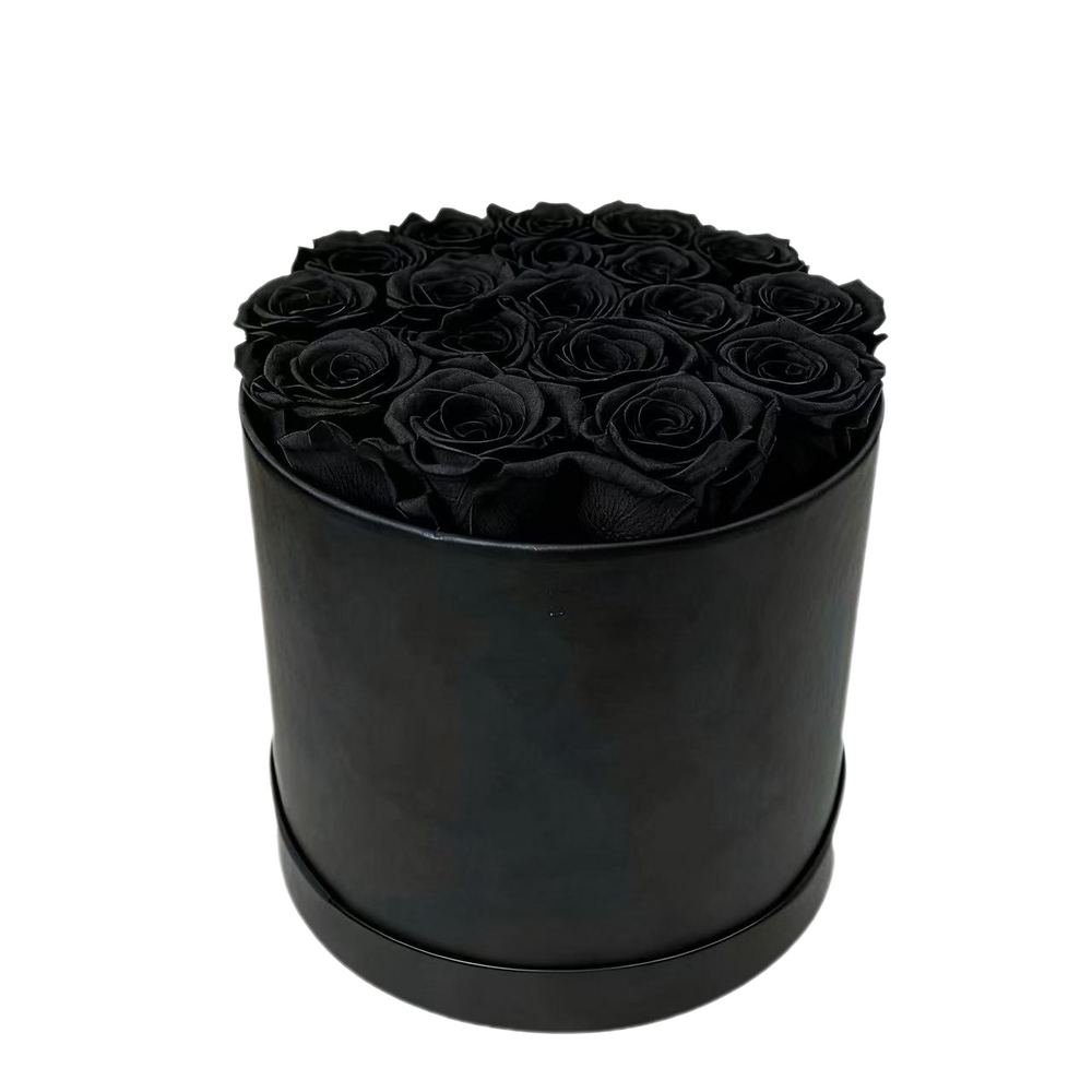 This Round box features 18 Red forever roses. Hand-picked and hand-crafted by the finest artisans, our preserved roses are placed in a Black box. The Parisian hat box design evokes elegance, and features an embossed gold Floral Isle stamp that adds a touch of luxury.