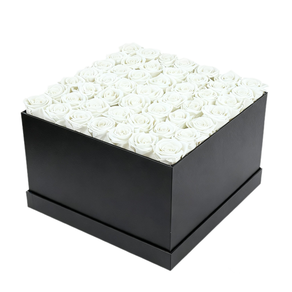 This square box features 49 Red forever roses. Hand-picked and hand-crafted by the finest artisans, our preserved roses are placed in a Black box. The Parisian hat box design evokes elegance, and features an embossed gold Floral Isle stamp that adds a touch of luxury.