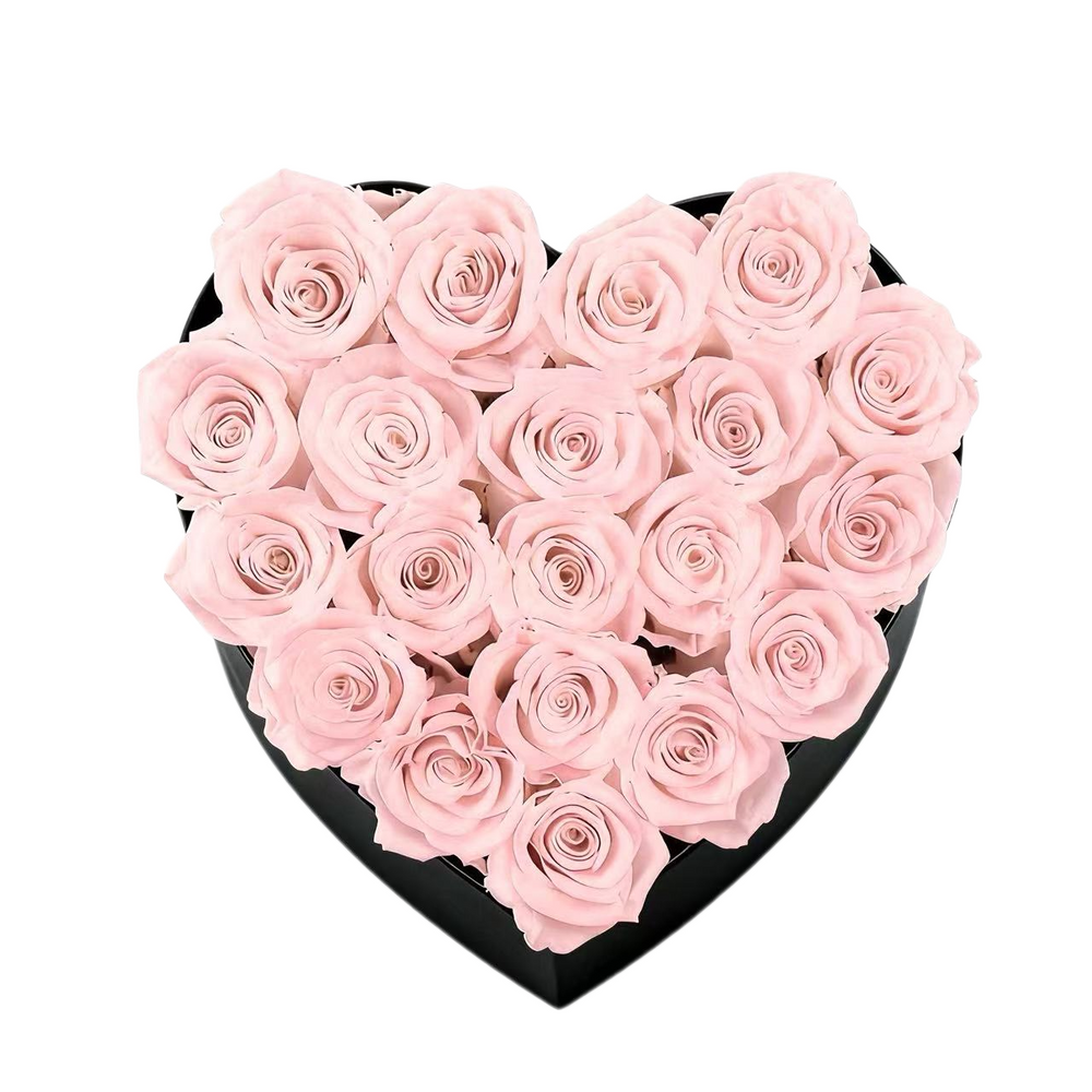 This Heart Box features 20 Red forever roses. Hand-picked and hand-crafted by the finest artisans, our eternity flowers are placed in a heart-shaped Black box. The unique Parisian hat box design evokes romance and elegance, and features an embossed gold Floral Isle stamp that adds a touch of luxury.